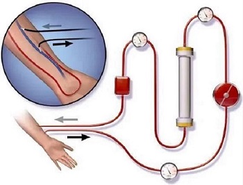 将患者血液在德国原装进口自体血免疫诱导仪器设备作用下,引出体外,建立体外循环并抗凝,血液流经血浆分离器分离出血浆,将血浆引入免疫吸附器与免疫吸附剂接触,以选择性吸附的方式清除血液中致病物质,同时在输入特定浓度氧化剂,几微秒内就会和血液内的物质发生化学反应,产生各种免疫细胞和抗病毒因子,然后将净化的血浆回输患者体内,达到治疗目的。