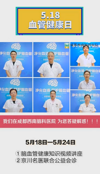 今年的5月18日是第十个全国血管健康日。为了响应健康中国2030的号召、普及脑血管健康方面的相关知识、提高大众脑血管健康管理意识、提升脑血管健康水平,降低脑血管疾病发病率。成都西南脑科医院将于5.18-5.24期间开展“净化血液 保护脑血管”血管健康日特别活动。