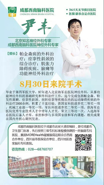 尹丰北京成都之间往返,只为服务更多脑科病患我院神经外科尹丰,是中国人民解放军海军总医院神经外科教授,也是中国微循环学会神经变性病专业委员会青年委员会常务委员、中国医师协会神经调控专业委员会青年委员,承担过多项级科研课题研究。从医20余年,尹丰已主刀完成各类疑难神经外科手术5000余例。