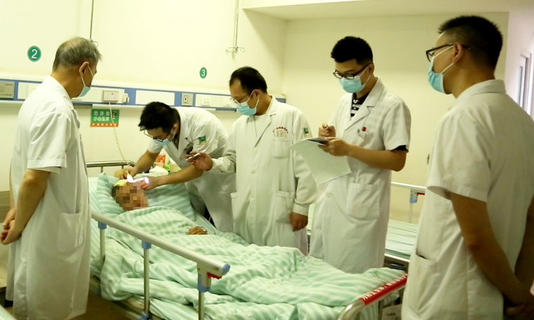 病房内,黄光富教授正带着医生们认真仔细的查房,耐心与患者及其家属沟通,详细了解病情,仔细查看片子。并通过与患者握手、拍肩膀等抚慰动作,向患者传递信心。