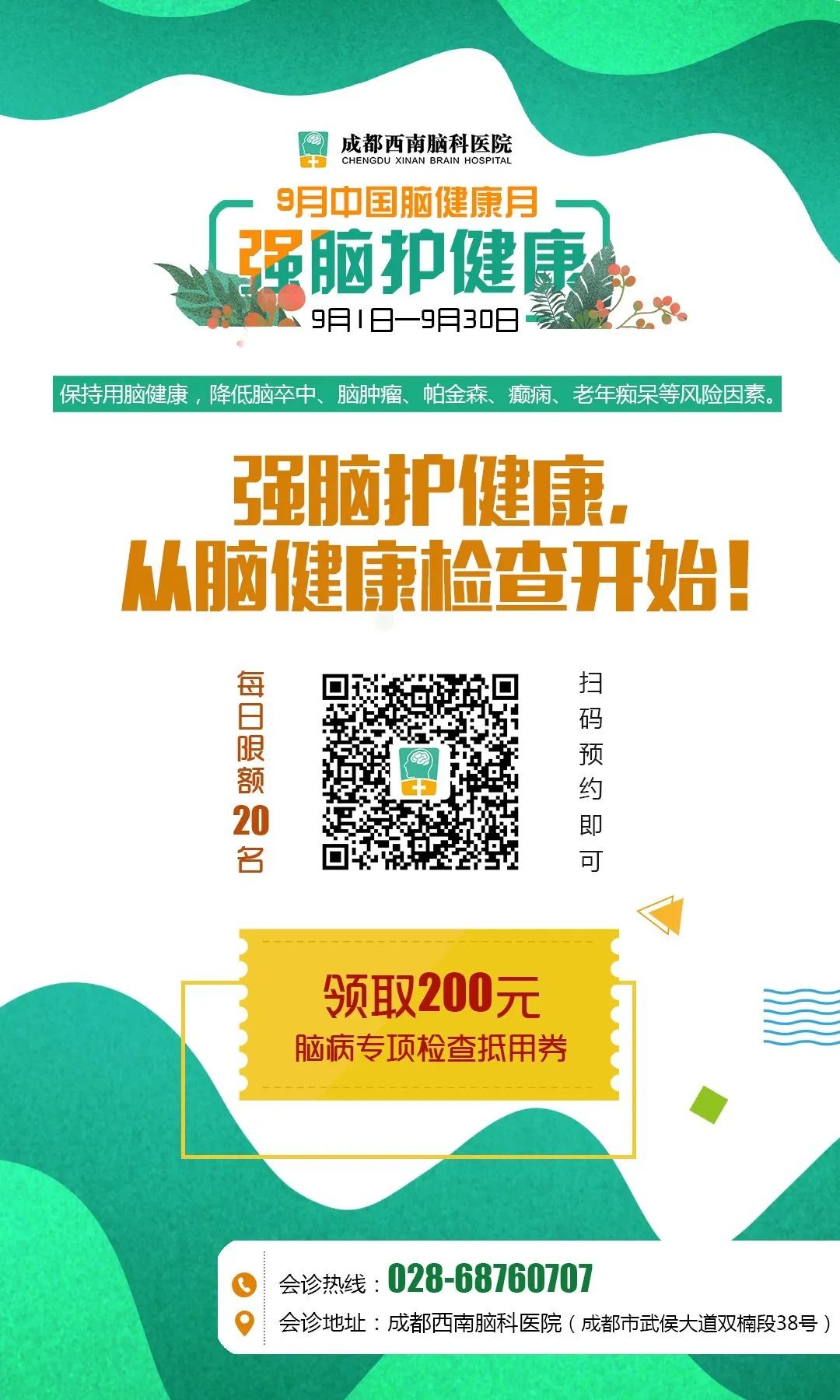 今年9月是第20个中国脑健康月,作为西南地区家脑病专科医院,我院推出了2020脑健康月“强脑护健康”大型公益特别活动。对于大部分人群来说,早期进行“脑健康”体检,可防范于未然。为此,我院将根据不同人群需求制定相关脑科筛查项目。强脑护健康,从脑健康体检开始!