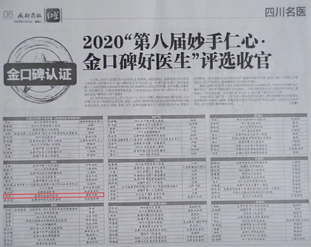 热烈祝贺我院神经内科张平主任在2020年第八届“妙手仁心·金口碑好医生”评选中,荣获“内科十强好医生”!