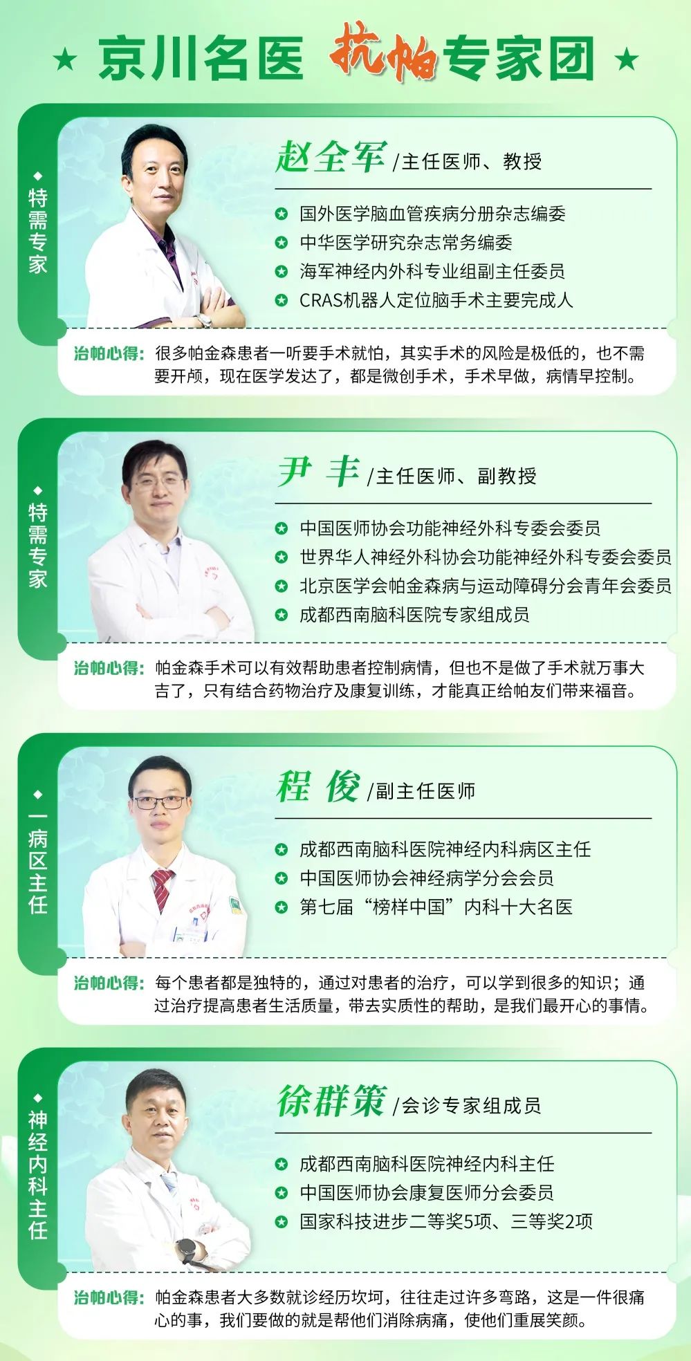 为解决帕金森患者经济负担等就医难题,帮助患者群体树立战胜疾病的信心早日回归幸福生活,我院联合成都市残疾人福利基金会提供“医路有你”专项补贴,援助贫困、重症帕金森患者,高可申请5000元的治疗费用补贴。
