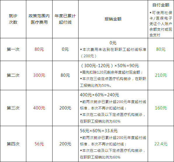问:成都市医保参保人在职职工小李2023年内,第一次因感冒先到某社区卫生服务中心门诊就诊花费80元,第二次因肺炎到某三级医院门诊就诊花费300元,第三次因癫痫发作到某二级医院门诊就诊花费400元,第四次因上呼吸道感染到某社区卫生服务中心门诊就诊花费56元,他分别能够报销多少钱?