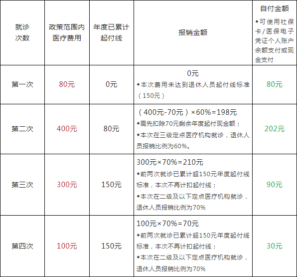 问:成都市退休参保人员张大爷2023年内,第一次因头晕头痛到某社区卫生服务中心门诊就诊花费80元,第二次因上呼吸道感染到某三级医院门诊就诊花费400元,第三次因脑短暂缺血到某二级医院门诊就诊花费300元,第四次因恶心呕吐到某社区卫生服务中心就诊花费100元,他分别能够报销多少钱?