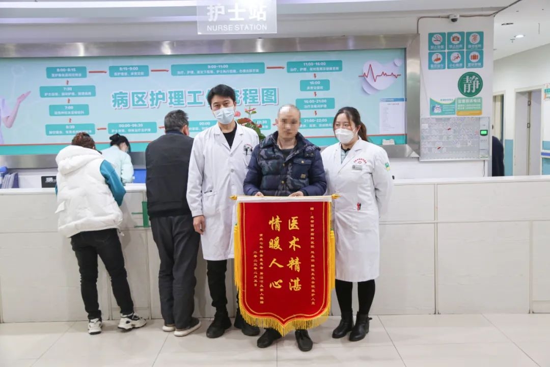 出院之前,胥先生和妹妹特意准备了一面锦旗送到了医生办公室,由衷表达对全院医护人员精湛技术和优质服务的感激之情。“真的很感谢你们,你们辛苦了!从重庆荣昌来到这里,我们没有白跑一趟!”胥先生的妹妹激动地说道。