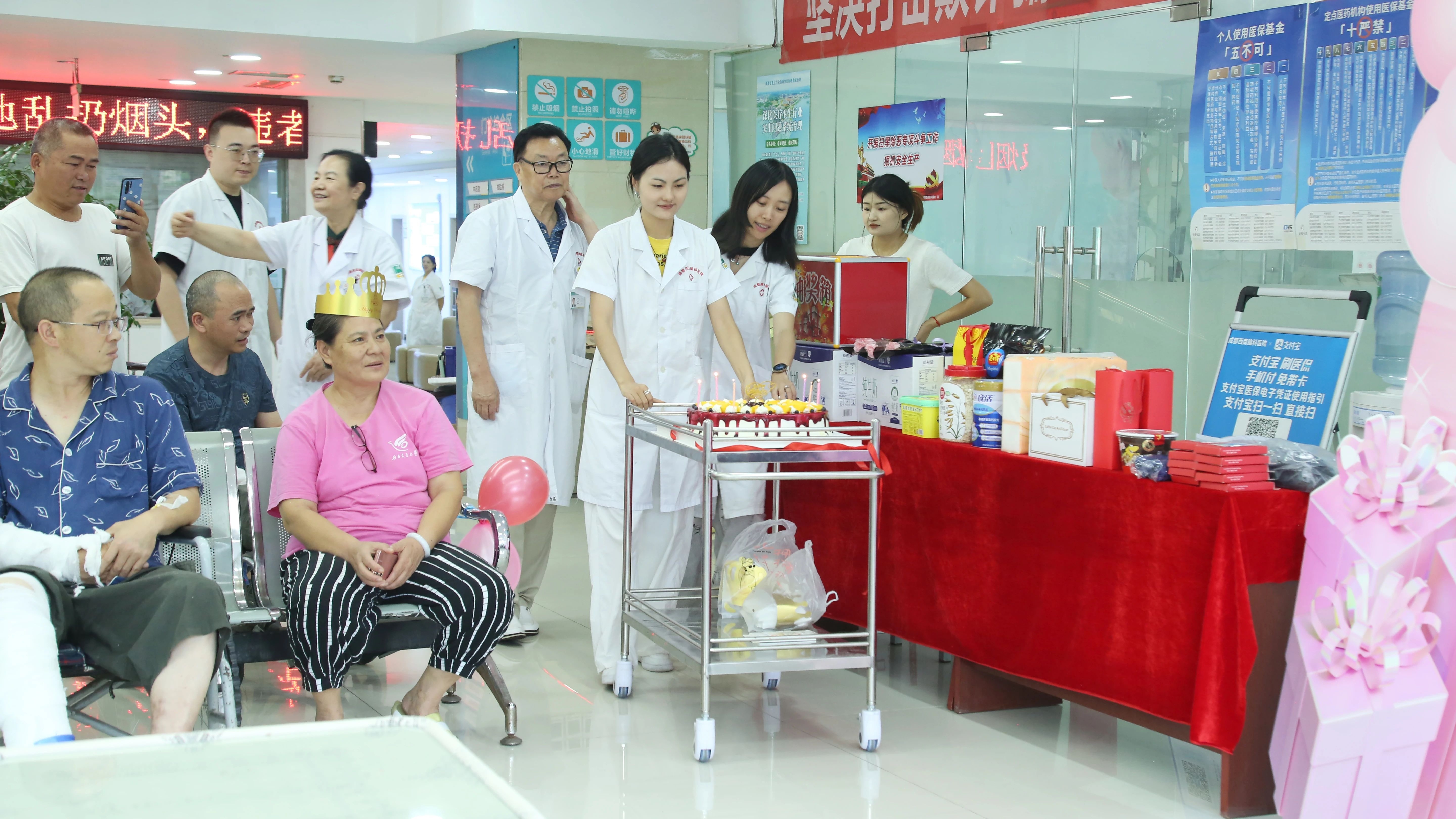 下午3点,寿星们陆续来到医院大厅,在仪式感满满的氛围中,在真挚的祝福声中,戴上生日帽,欢乐开启生日派对。